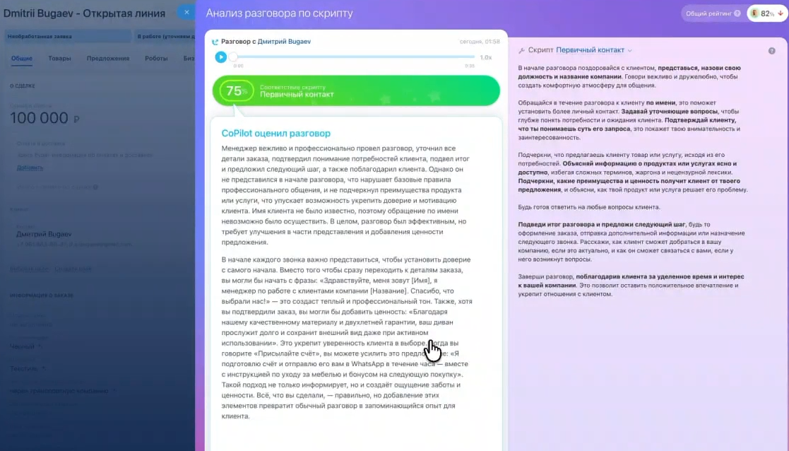 После звонка в карточке CRM можно открыть анализ разговора и использовать его для управленческих решений.
