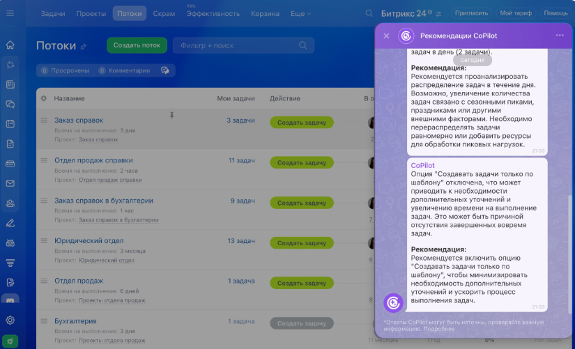 Какие рекомендации может дать ИИ в потоках? Например, добавить больше информации в шаблон задачи или снизить нагрузку на определенного сотрудника. Из рекомендации можно будет создать задачу или встречу, обсудить все данные и внедрить предложенные изменения.