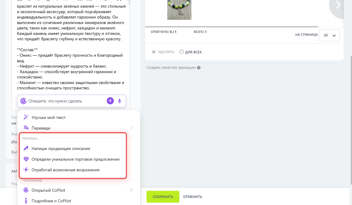 ИИ помогает создавать описание товара на основе характеристик, подчёркивать особенности и отработать возможные возражения клиентов. Доступны как готовые сценарии, так и возможность писать собственные запросы.