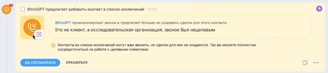 В Битрикс24 давно есть возможность добавлять звонки и сообщения в исключения. Новый AI-сценарий предлагает добавить контакт в список исключений и указать причину, а пользователь уже самостоятельно принимает решение — согласиться или отклонить предложение.