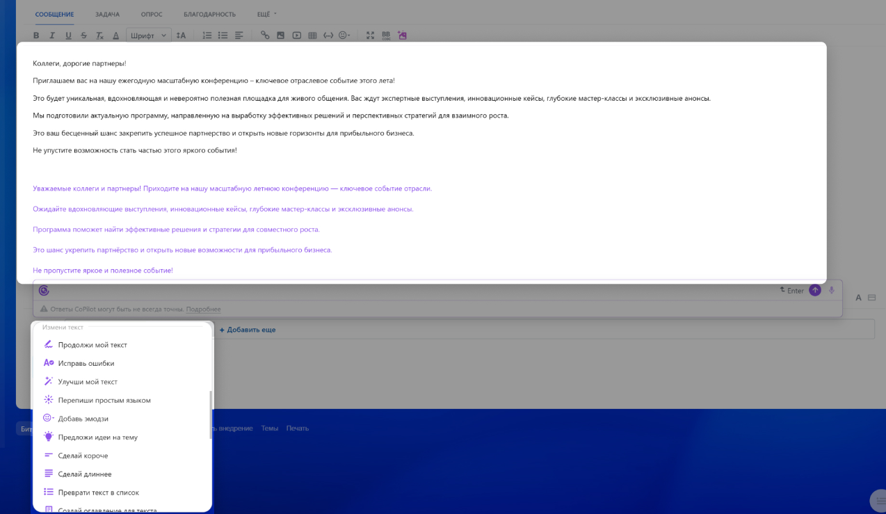 - экономия времени на постановку задач, набросайте черновик, а дальше редактируйте его с помощью BitrixGPT;