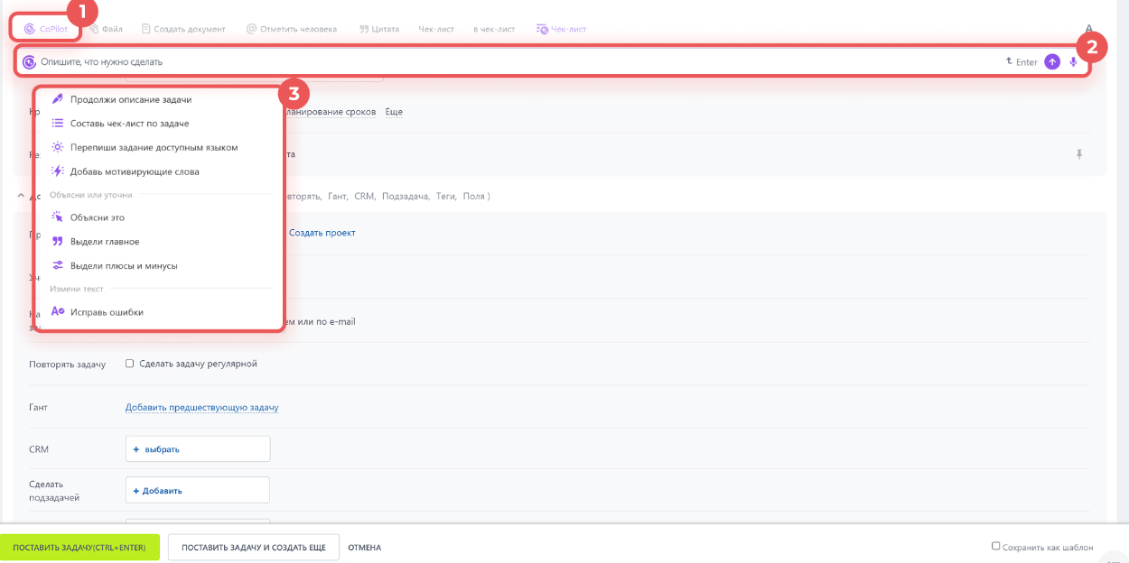 При помощи ИИ в задачах вы можете набросать черновик описания, а BitrixGPT превратит его в четкое и понятное описание и даже составит чек лист в один клик. А также ИИ прочитает все комментарии к задаче, выделит главное и поможет подготовить ответ.