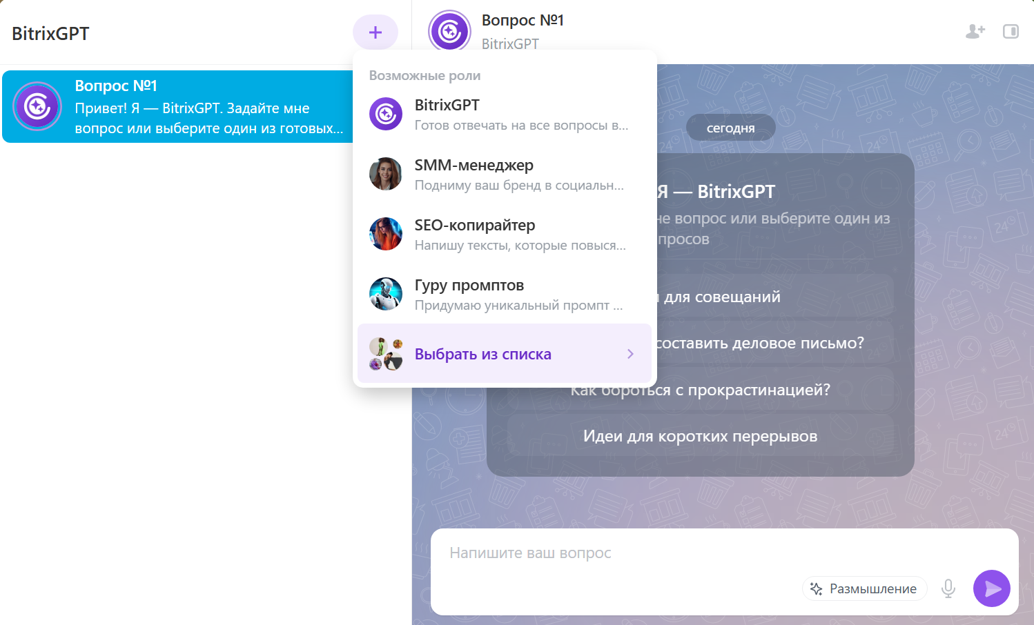 Рассмотрим сценарий ведения диалога с BitrixGPT в отдельном чате. Здесь представлен разнообразный набор ролей, с кем вы хотите пообщаться: юрист, маркетолог, SMM-менеджер, бизнес-аналитик и другие. В общем выберите роль и начинайте общение, а если запрос на общие темы, выберите роль «Универсальный BitrixGPT».