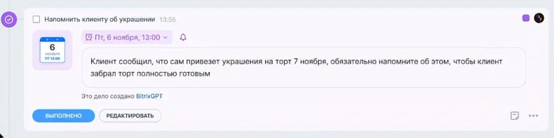 После общения с клиентом BitrixGPT автоматически создаст дело для сделки: укажет заголовок, описание и назначит срок. Например, если клиент попросил перезвонить через полчаса, уточнить детали, договориться о скидке или ждать от него информацию ─ ИИ распознает такие запросы и превратит их в задачи, чтобы вы не забыли ни о чём. Клиент оценит, что вы не только слушаете, но и помните даже его обещания.