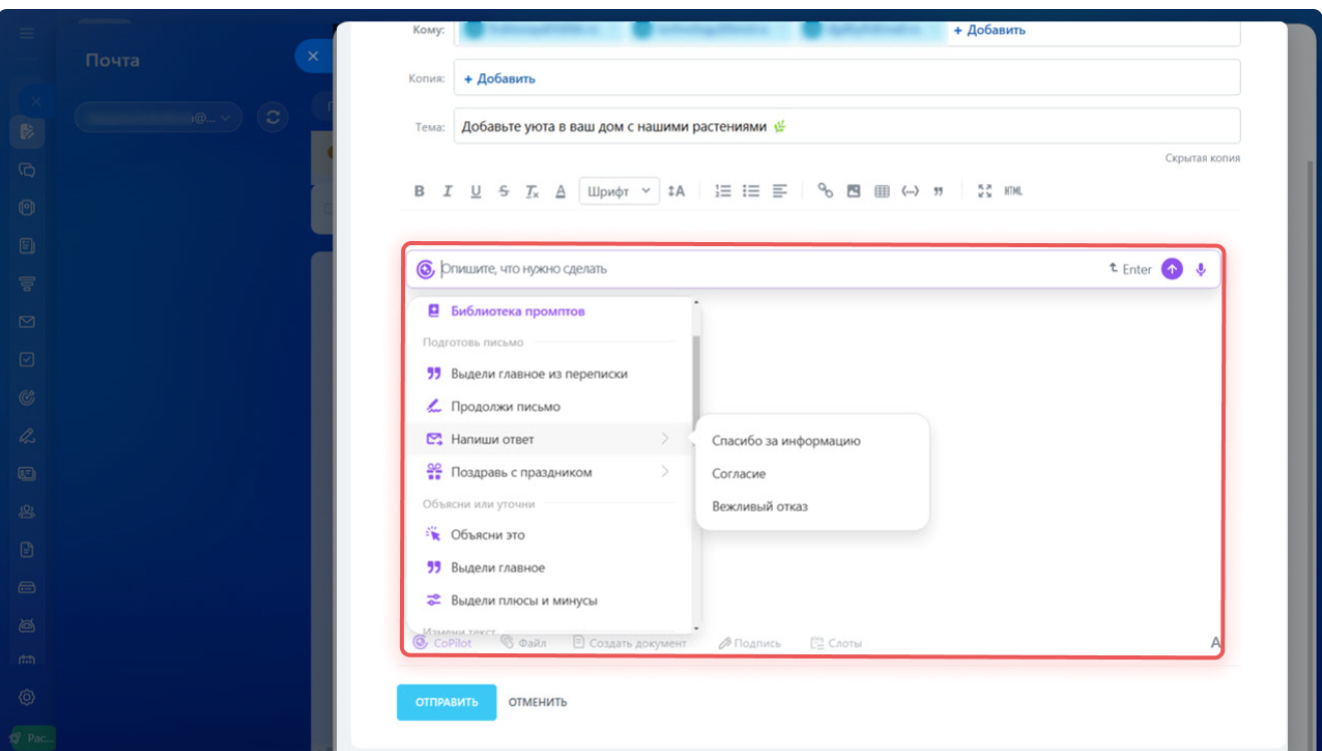 В почте тоже имеется помощник в виде ИИ, который поможет выделить главное из переписки, напишет новое письмо или продолжит уже частично написанный текст. Здесь есть как готовые сценарии (препромпты), так же есть возможность написать свой промпт (запрос).